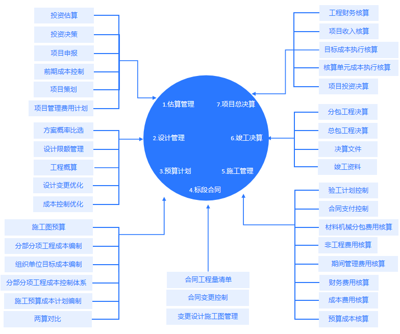 从项目中标到工程交付业主的全过程费控(成本)管理,工程总承包合同价款明细,与项目管理、设计、施工到竣工投产整个过程发生的建安、设备、材料等所有费用的对比监控,现金流、及产值与成本比值等监控。注意把握边界和颗粒度,与项目的工程造价体系(工程估算、概算、预算、变更、结算)进行区别;如果客户需要,专业模块可请第三方造价团队共同完成,并提供行业数据库对接和针对项目的工程造价咨询服务。