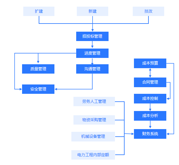 ③适合性——以电力工程的核心业务(项目管理)出发的业务方案设计,根据项目管理模式设计信息化解决方案,最贴合电工工程管理的需要。
