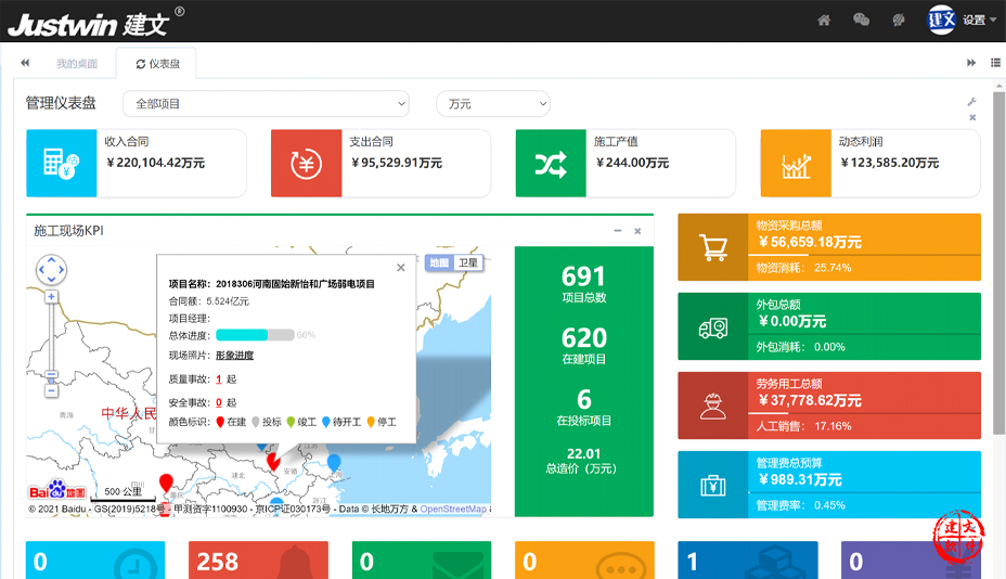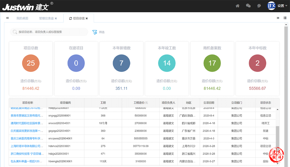 1.建立统一的项目管理平台,将系统集成项目从商务阶段一直到竣工、售后的各个环节贯穿起来;建文系统集成平台以统一、直观、汇总的方式,将一个项目从商务阶段一直到竣工、售后阶段的各个环节贯穿起来,以使管理人员可以即时掌握项目的进展情况、发现的问题,并对项目中的各关键节点、流程进行控制,确保进度、成本、质量、安全可控。