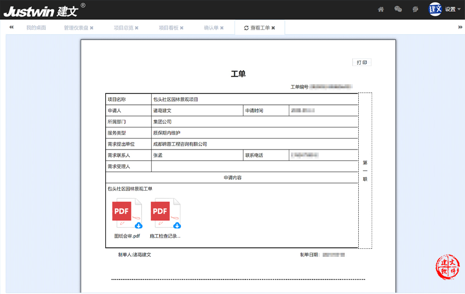 7.运维管理,建立售后服务管理系统,对项目售后过程中的维修服务进行管理。建文运维管理APP,解决多个工程项目下的后期运维管理,包括工单、受理单(派工)、处理单(执行)、确认单、巡检单、回访等功能,运维执行过程清晰明了,随时在线受理、处理、验证工程后期问题。