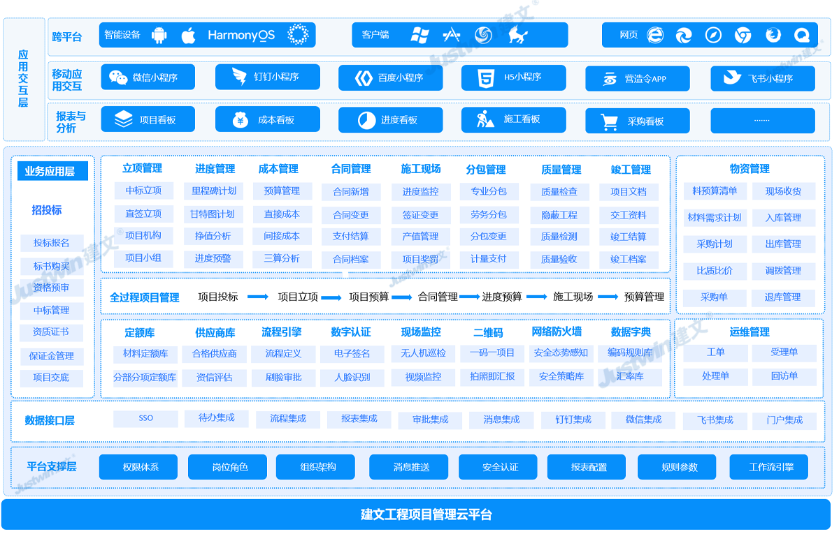 因此,建文工程项目管理软件在整体设计上,遵循以成本为核心,以进度和资金为双主线,以合同为约束的管理模式,主要完成四控四管一协调的工作,即过程四项控制(进度控制、成本控制、资金控制、质量安全控制)和四项管理(投标管理、合同管理、物资管理、预算管理)以及项目组织协调的工作。同时针对项目管理的每一过程遵循计划、实施、检查、处理(PDCA)的管理思路,形成计划-实施-检查处理的闭路循环。